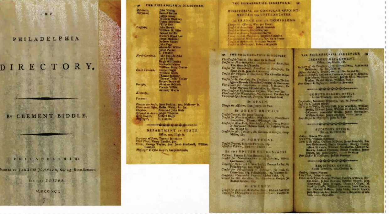 In 1791, the first city directory published in Philadelphia lists 21 “Ministerial and Consular Appointments to the United States” representing six foreign nations: France, Spain, Great Britain, Portugal, the United Netherlands, and Sweden.