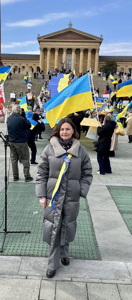 The Honorary Consul of Ukraine and In Unity UA organized a rally at the Philadelphia Art Museum and a march to Philadelphia City Hall in support of the Ukraine’s fight for freedom, four years after Russia’s full-scale invasion. Led by Iryna Mazur, Honorary Consul of Ukraine, the program’s speakers stirred the large crowd with comments demanding greater commitment to the war effort and honoring those who have sacrificed everything in their fight for national survival.