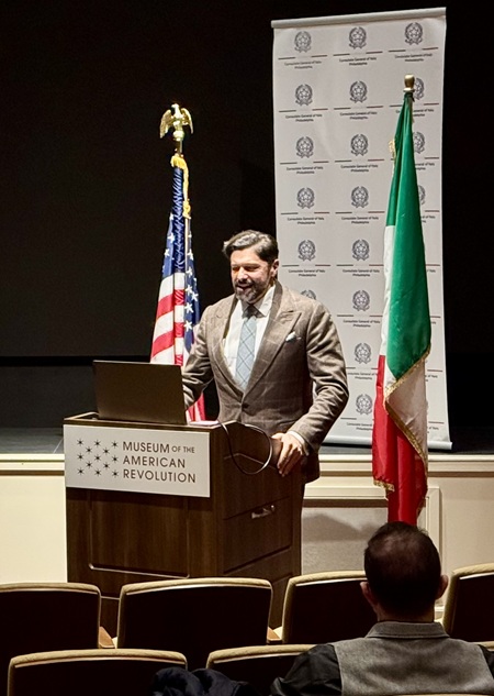 In celebration of the United States’ 250th birthday, the Italian Consulate General in Philadelphia has organized a series of lectures which explore Italian influences on the founding of America. The initial program, titled “Happiness as the Supreme Law: Gaetano Filangieri and the Declaration of Independence at the 250 Year Mark”, was hosted by Consul General Nico Frandi at the Museum of the American Revolution where Professor Amedeo Arena, lectured virtually from Universita Federico II in Naples, Italy. Filangieri was an 18th century Italian jurist and political philosopher, who developed a close correspondent friendship with Benjamin Franklin and influenced the thoughts expressed in the Declaration of independence. Many of the original Filangieri-Franklin letters are archived at the American Philosophy Society and the Historical Society of Pennsylvania in Philadelphia.